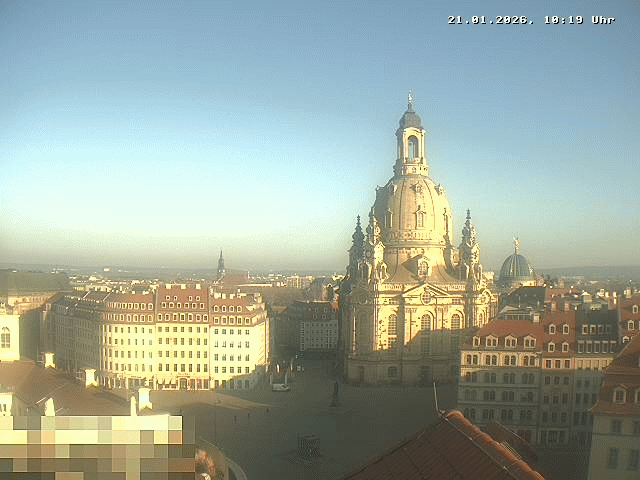 live view over the Frauenkirche (Church of Our Lady) located in the Neumarkt (Market Square( of the capital cityof the German state of Saxony, a beautiful town characterised by an irresistible combination of romantic landscape, baroque architecture and one of the most beautiful historic city centres in Germany.