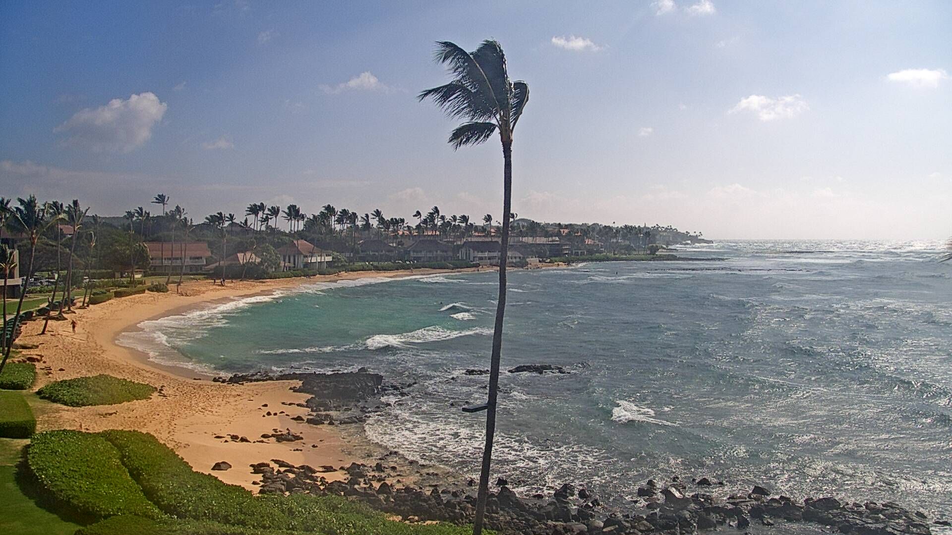 live view over the Kiahuna Beach from the 4-star Sheraton Kauai Resort (a popular, scenic beach known for its white sand, excellent swimming and beginner-friendly surfing, a quieter extension of the neighboring Poipu Beach)webcam hosted by Sheraton Kauai Resort, a 4-star hotel located just a few steps from the Kiahuna Beach featuring